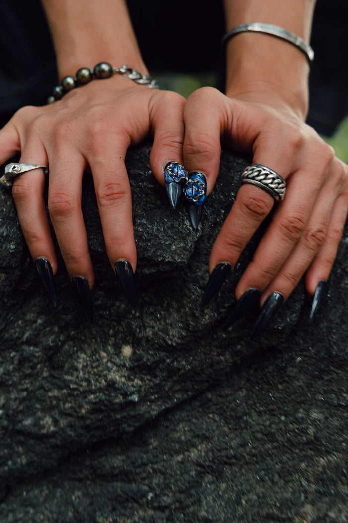 TAIZANのシルバーリングは、時間と共に酸化し、独自の黒を纏い、世界に一つだけの色を刻みます。時の痕跡は、まさに侘び寂び。「経年劣化」ではなく、「経年進化」。